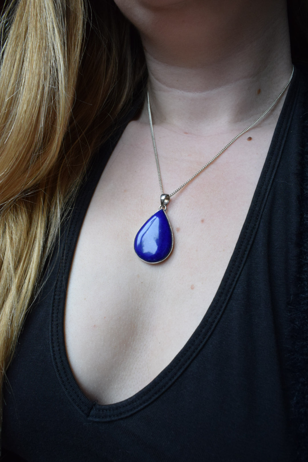 Gorgeous deep blue sterling silver lapis lazuli pendant measuring 1.5 inches long.