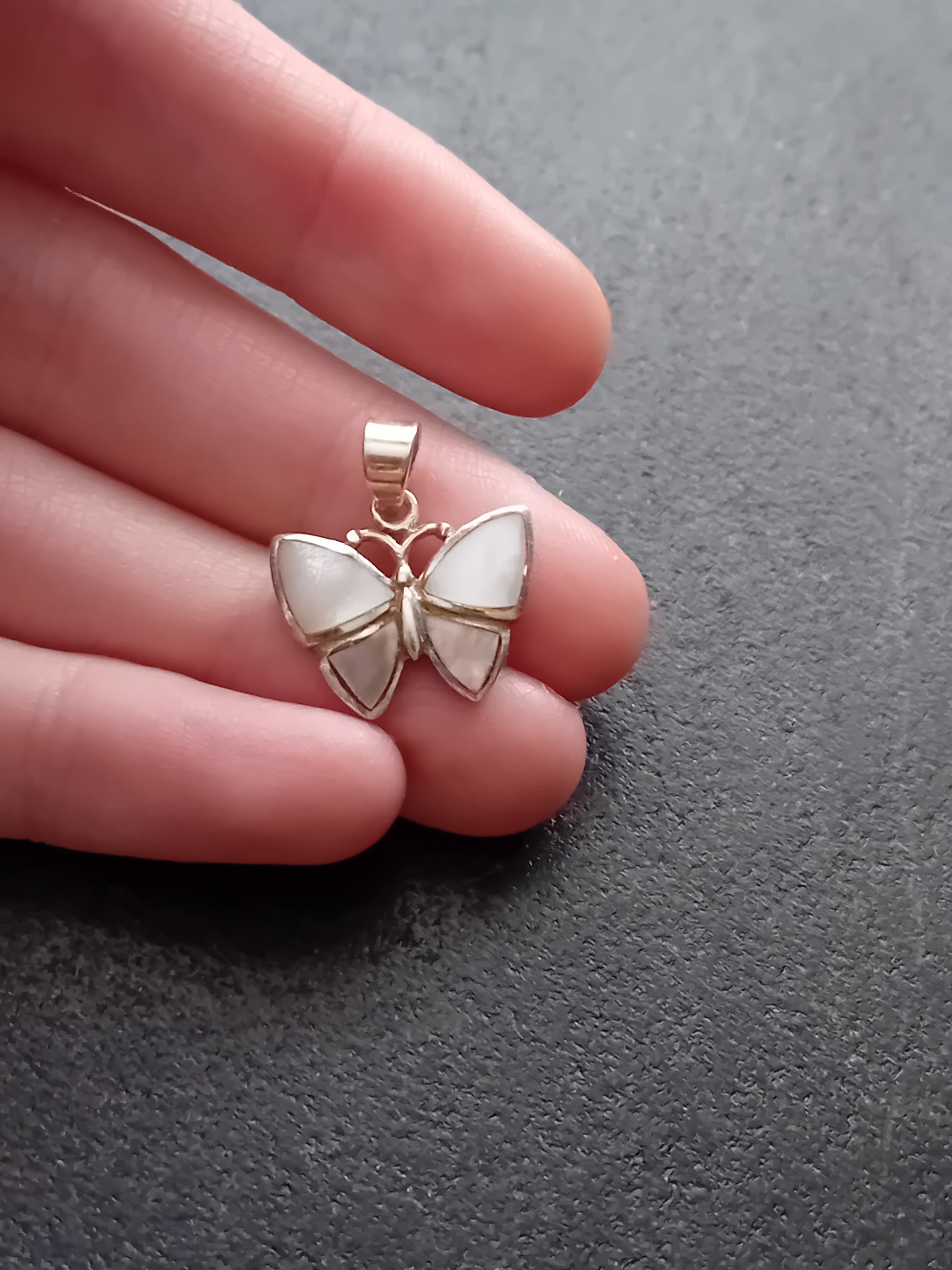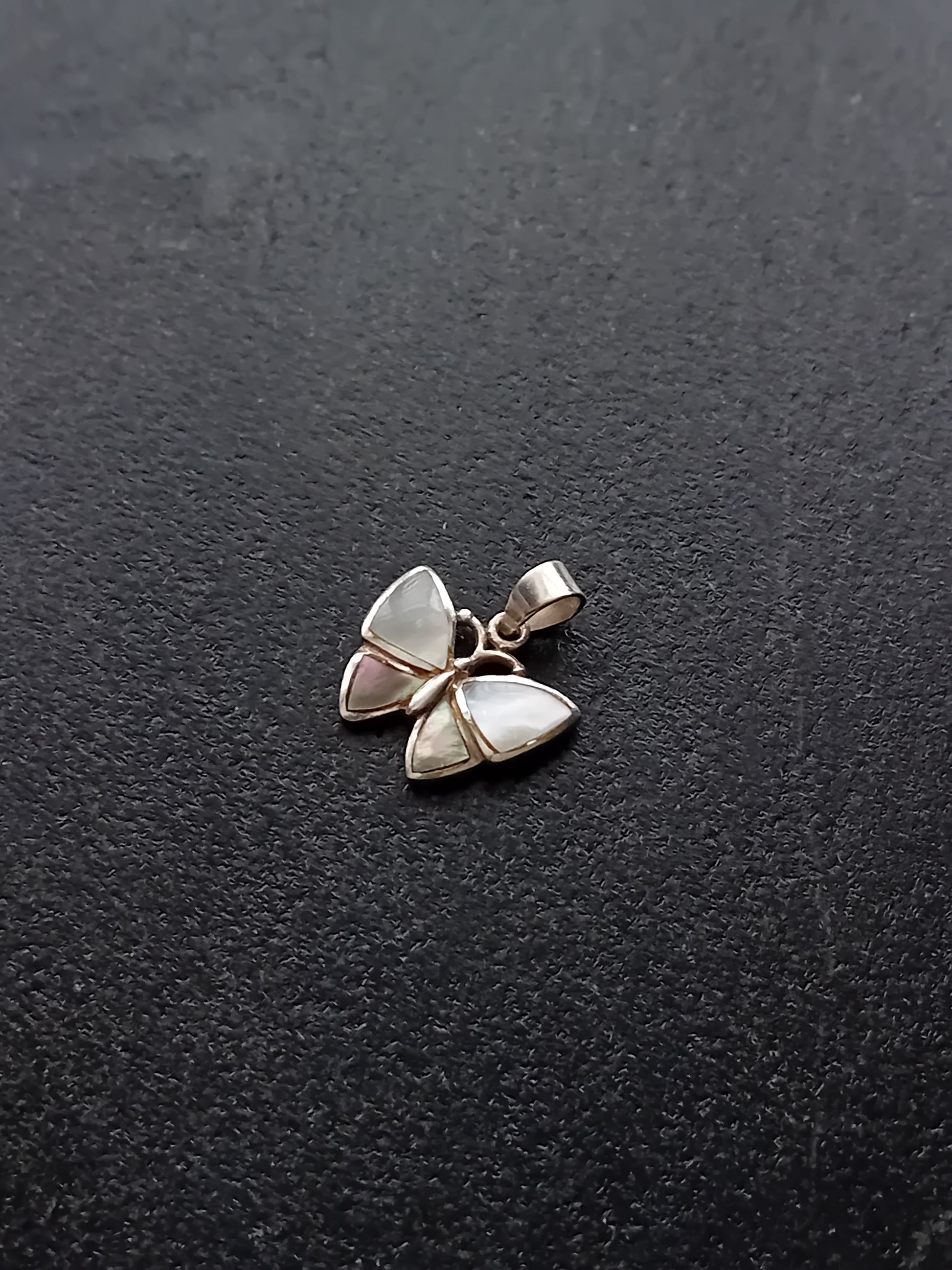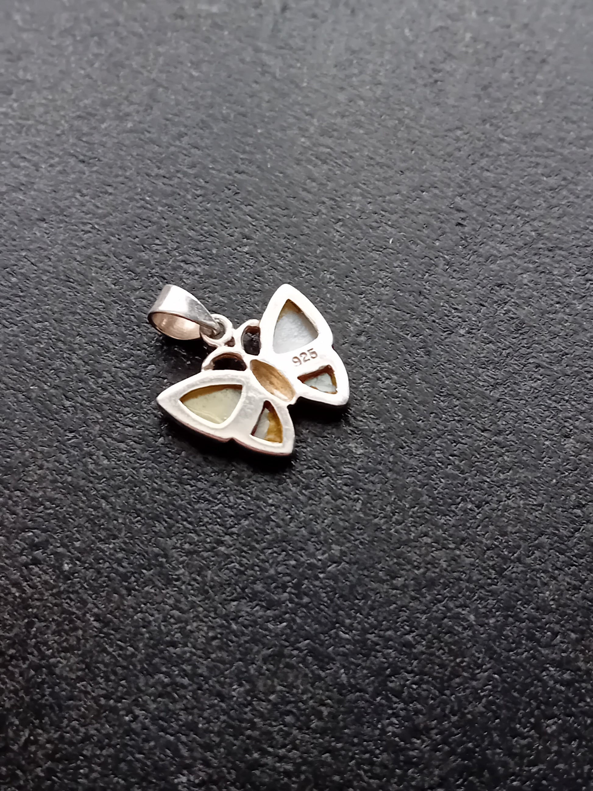 Sterling silver mother of pearl shell butterfly pendant measuring 0.7 inches long.