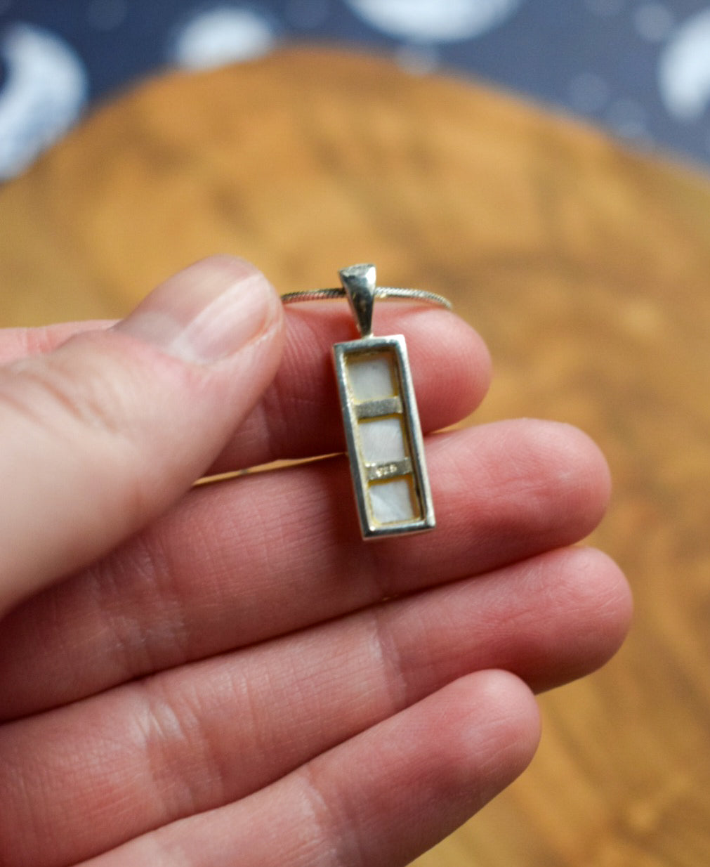 Sterling silver (hallmarked) mother of pearl pinkish white pendant measuring 1 inch long and hung upon an 18 inch 925 sterling silver snake chain.