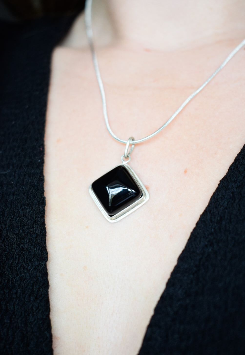 Stunning sterling silver onyx pendant measuring 1 inch long. Hung upon an 18 inch sterling silver snake chain.
