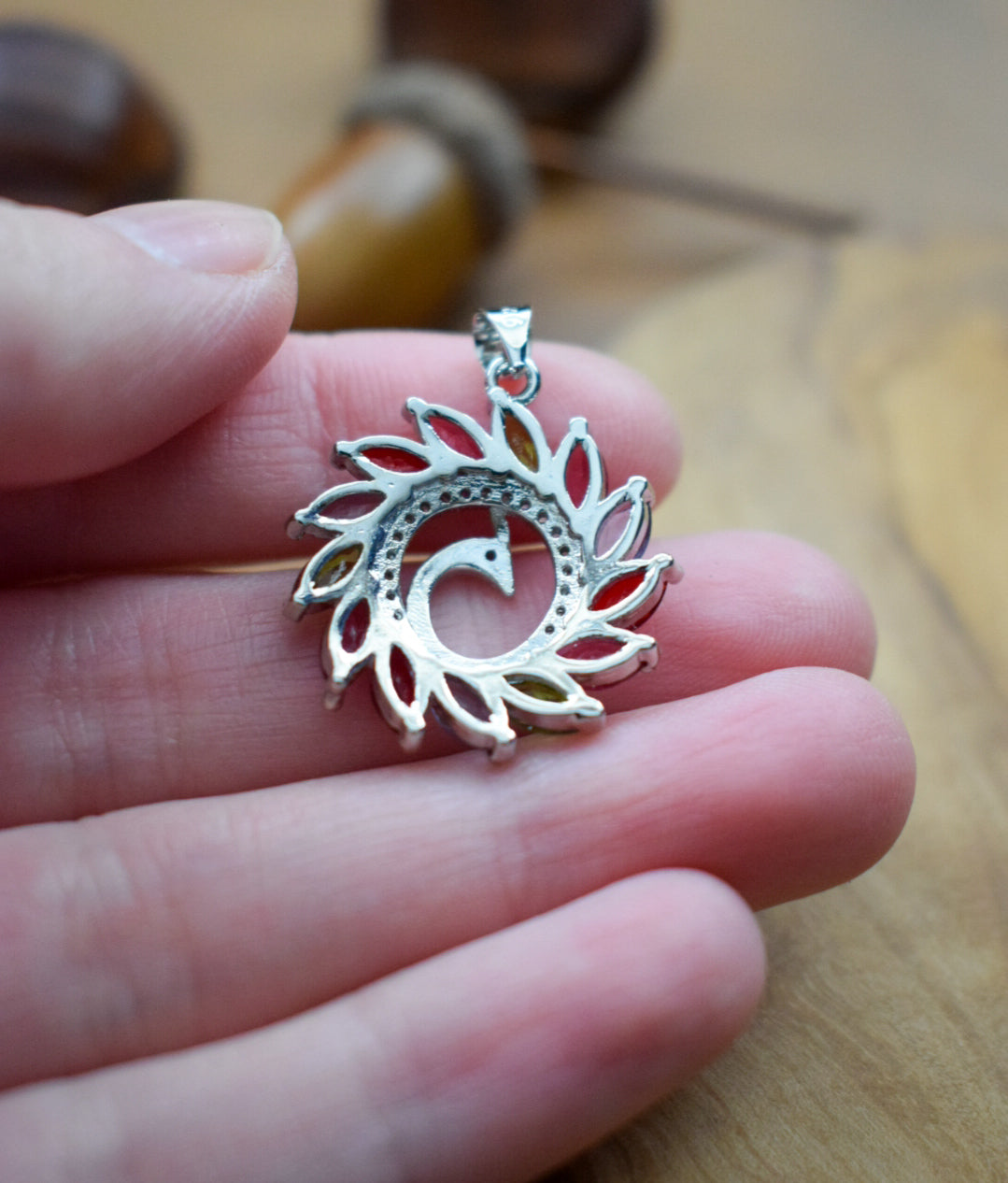 Sterling silver peacock pendant measuring 1 inch long and hallmarked.